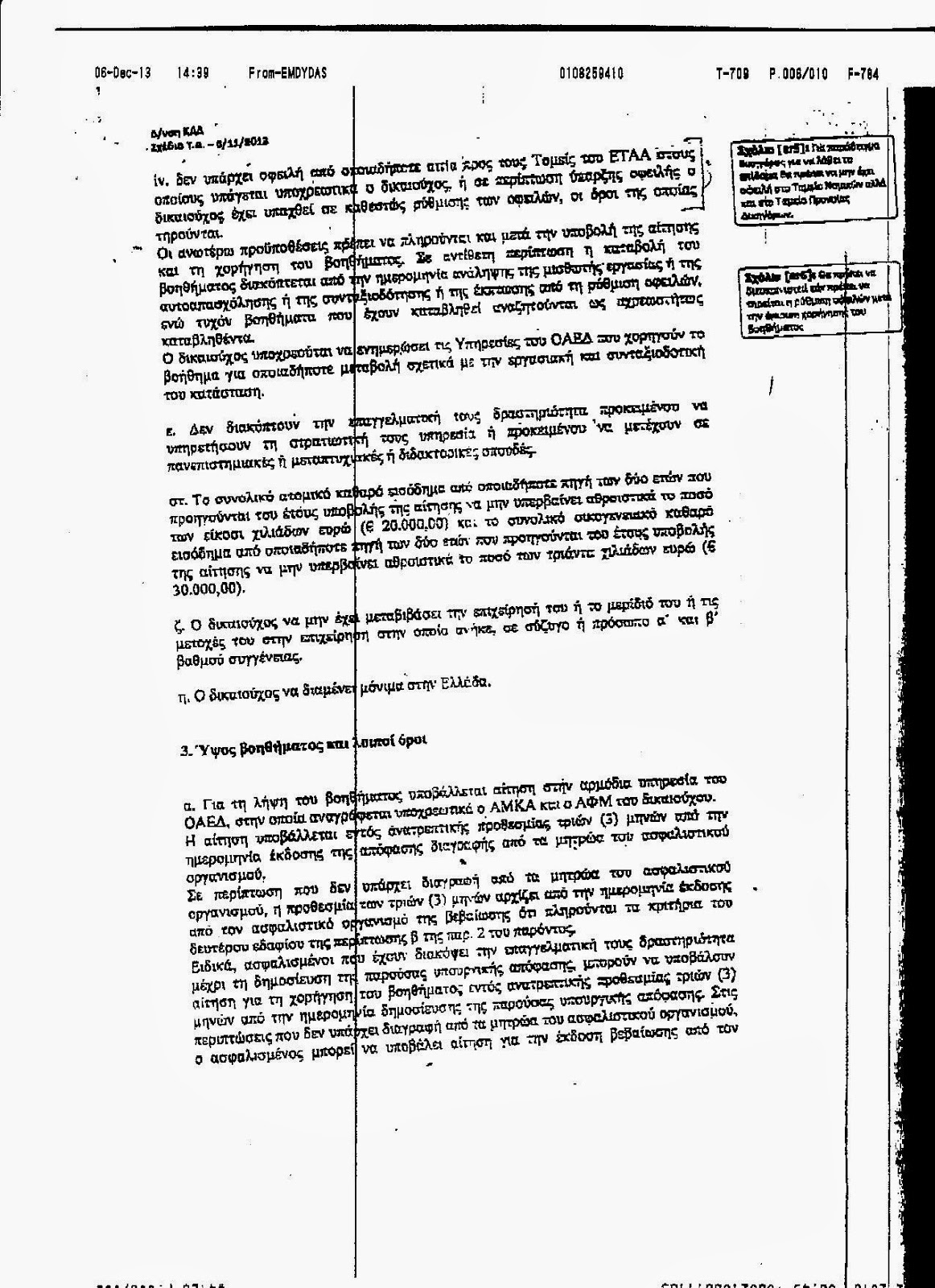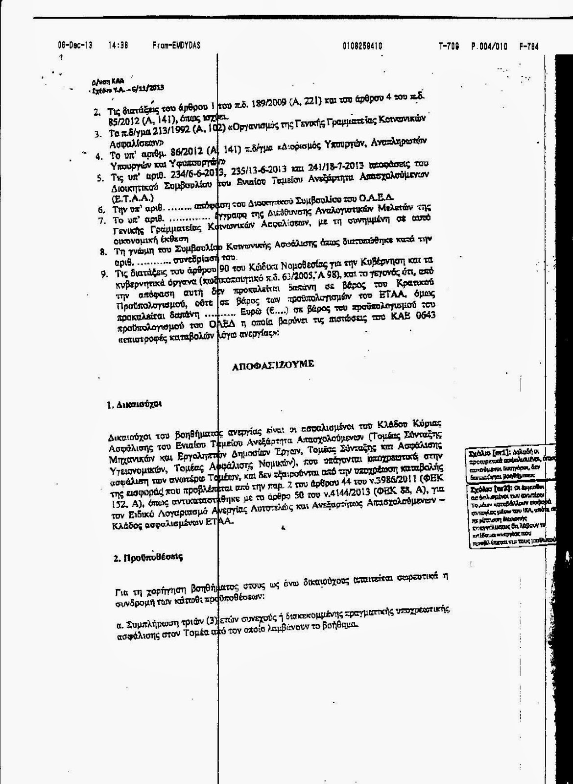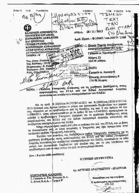 Αναρτούμε το έγγραφο το οποίο έστειλε το υπουργείο "Εργασίας" προς το ΕΤΑΑ το οποίο εκθέτει την Υπουργική Απόφαση με τους όρους και τις προϋποθέσεις για να λάβει κάποιος ασφαλισμένος στο ΕΤΑΑ (μηχανικός, γιατρός, δικηγόρος) επίδομα ανεργίας. Μην κουράζεστε να διαβάζετε, σας το λέμε εμείς, δεν το δικαιούται σχεδόν ΚΑΝΕΙΣ. Προϋποθέσεις: 3 χρόνια τουλάχιστον ασφαλισμένος, 3 μήνες διακοπή επαγγέλματος πριν, καταβολή της μηνιαίας ειαφοράς των 10€ για 3 χρόνια και κυρίως να μην έχουν οφειλές στο Ταμείο (τώρα πως γίνεται κάποιος να έχει διακόψει επάγγελμα και να μην έχει οφειλές, δεν το ξέρουμε). Και όλα αυτά για 360€ το μήνα (για μάξιμουμ 8 μήνες) που δε φτάνουν ούτε τις εισφορές του ΤΣΜΕΔΕ να καλύψουν. Έλεος με το δούλεμα πιά...